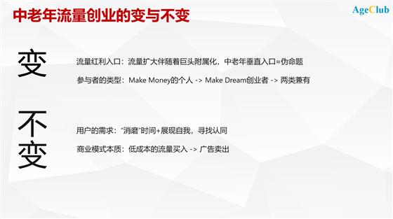 至于变化的部分,一个是流量的入口在变,随着流量的扩大,更多的巨头公司将会下场,这意味着中老年线上垂直入口其实是一个伪命题;另一个变化则是不同阶段的参与者类型不同,从开始的以个人站长为主,到后面团队行创业者越来越多。