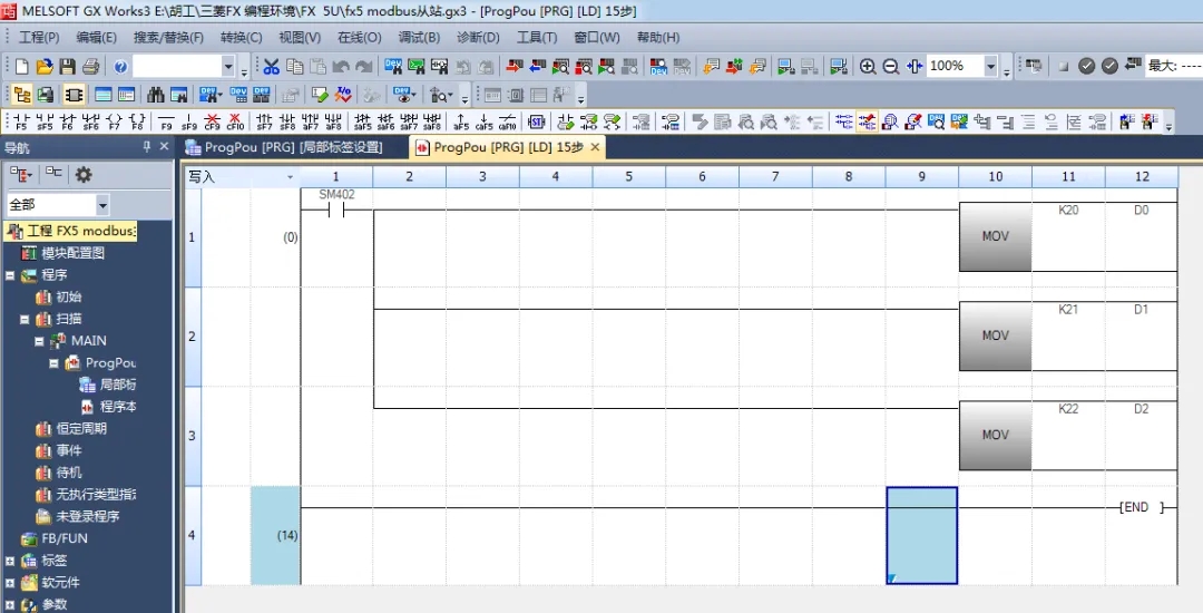 打开【fx5 modbus从站.gx3】从站程序源代码
