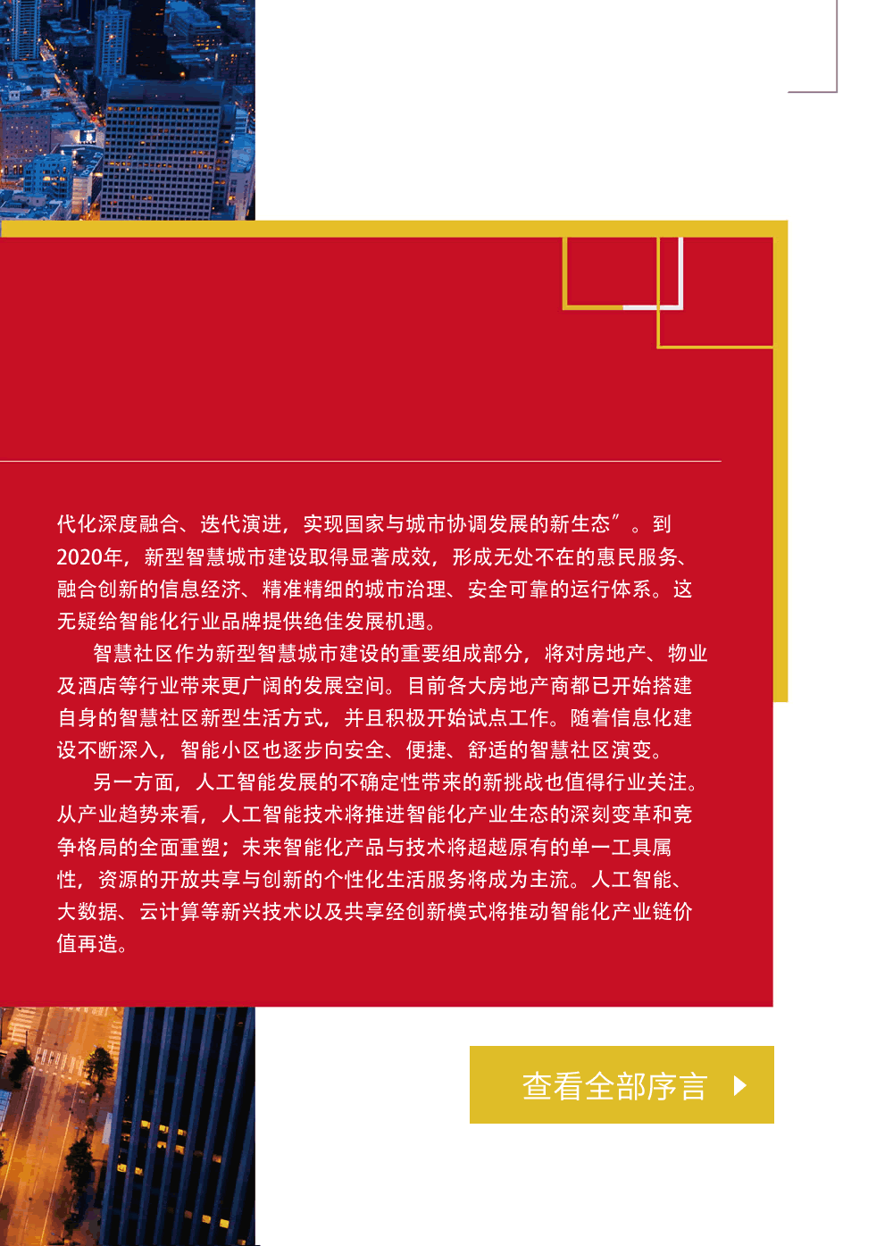 智慧社区作为新型智慧城市建设的重要组成部分,将对房地产、物业及酒店等行业带来更广阔的发展空间。目前各大房地产商都已开始搭建自身的智慧社区新型生活方式,并且积极开始试点工作。随着信息化建设不断深入,智能小区也逐步向安全、便捷、舒适的智慧社区演变。