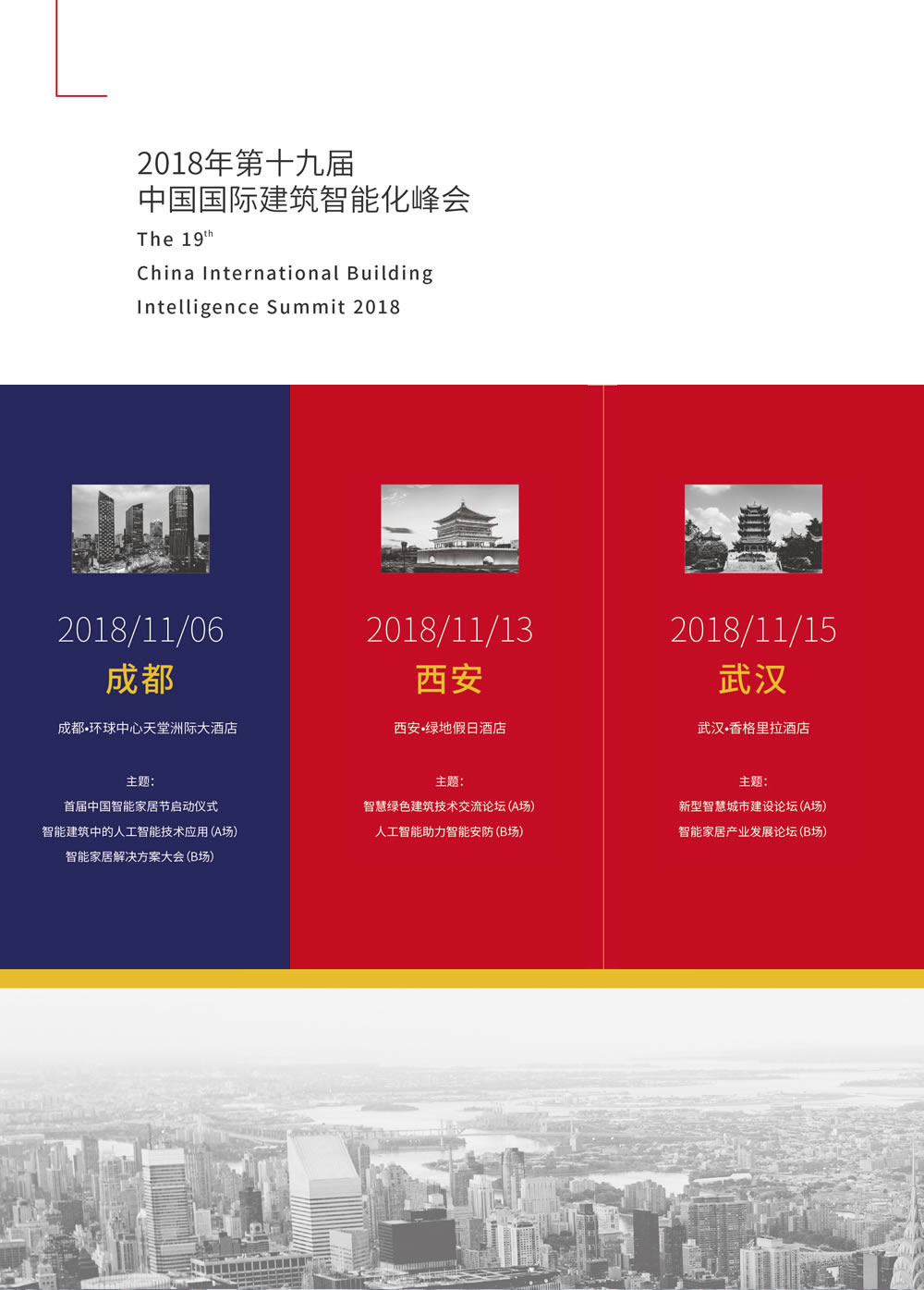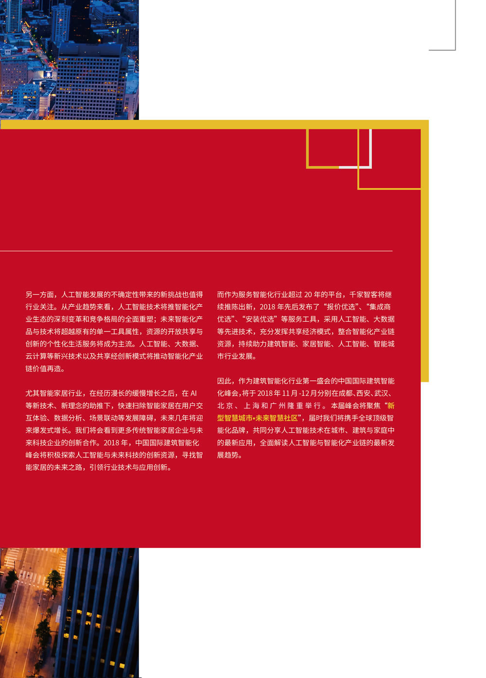因此,作为建筑智能化行业第一盛会的中国国际建筑智能化峰会,将于2018年11月-12月分别在成都、西安、武汉、北京、上海和广州隆重举行。本届峰会将聚焦“新型智慧城市•未来智慧社区”,届时我们将携手全球顶级智能化品牌,共同分享人工智能技术在城市、建筑与家庭中的最新应用,全面解读人工智能与智能化产业链的最新发展趋势。