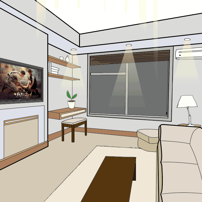 进门后轻轻一按“入门(回家)模式”的开关,客厅的吊顶灯、台式灯依次打开,电视打开、窗帘自动拉开,空调开启,一键联动所有家电。