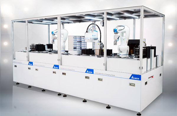 台达于汉诺威工业展整合三座机器人工作站、制造执行及可视化监控管理平台、智能输送线。