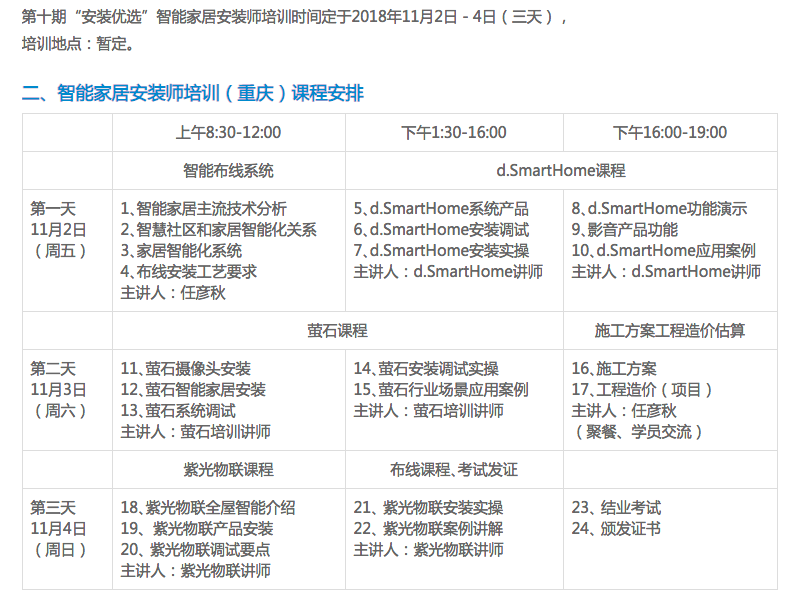 第九期能家居安装师培训将于11月2日-4日在重庆举办,本期培训班同样增设了智能家居综合布线课程模块,智能家居安装调试课程模块则安排了d.Smarthome智能家居、萤石智能家居、紫光物联智能家居三个品牌厂商进行授课,其系统各有特色,学员将可以更加全面地掌握智能家居安装技能。