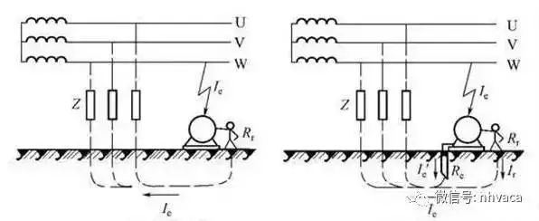 左图中,我们看到当发生单相接地故障时,由于地线的电阻远远小于人体的接触电阻,因此流过人体的电流被极大地减小了;右图中,系统未接接地线,因此当发生单相接地故障时,人体由于接触到了相电压,因此受到电击伤害的可能性极大。