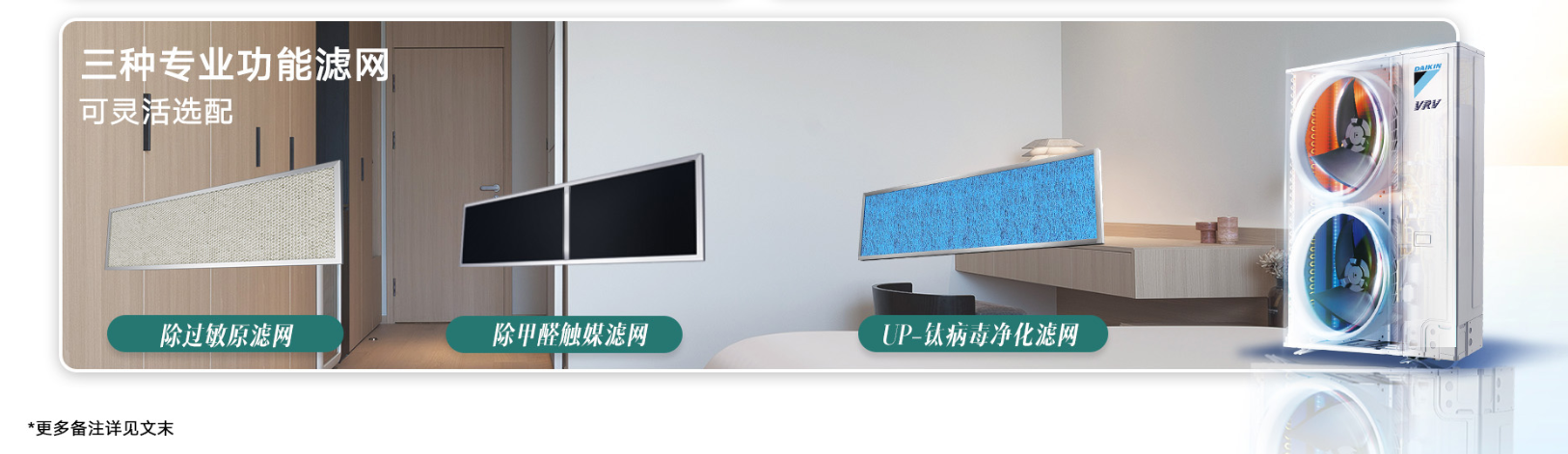 此外,针对室内不同空气污染隐患,大金还提供多种专业滤网灵活选配,实现健康空气的定制化守护。其中,除甲醛触媒滤网除甲醛率高达99%*4,可强效吸附分解空气中的甲醛; UP钛-抗病毒滤网通过其独特的多孔结构强力吸附病毒*5,有效应对流感季等病毒传播风险;除过敏原滤网可将霉菌、尘螨等过敏原高效拦截*6,全方位守护健康、安全、舒适的室内环境。