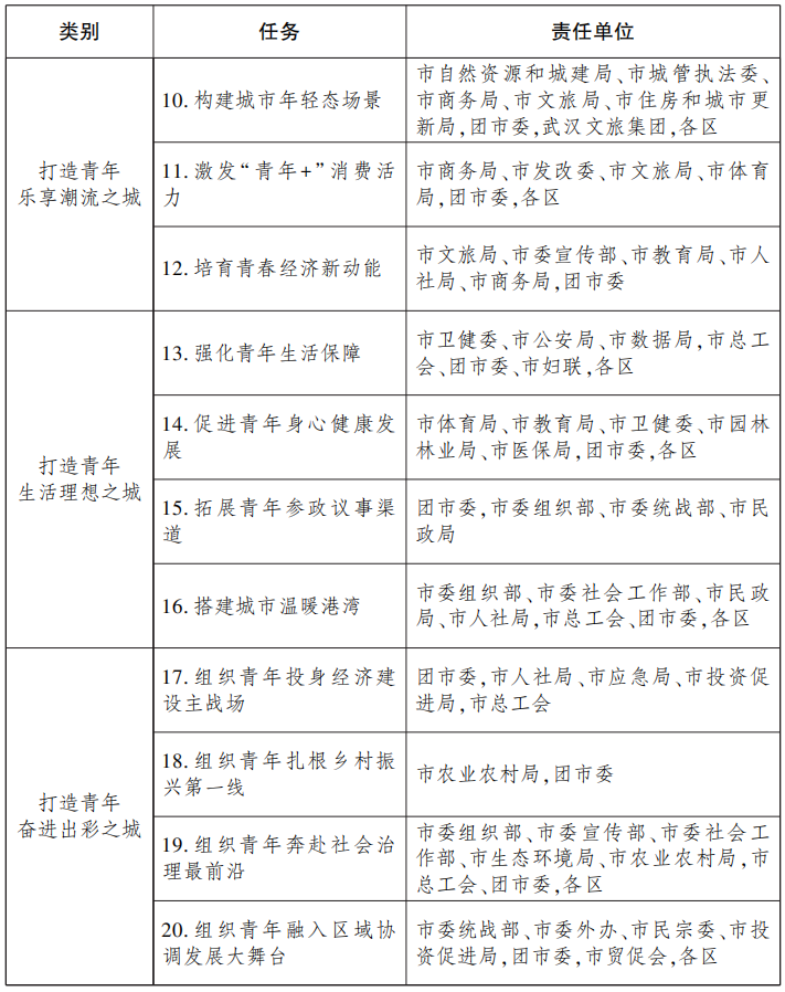10.构建城市年轻态场景。将涉及青年发展的教育、医疗等内容纳入国土空间总体规划,规划建设“一场两馆一园”等青年运动场馆。组织青年参与“五改四好”城市更新,打造更多适青化空间。精细运营汉口历史风貌区等片区,打造文化驿站、城市书房等青年主题空间。举办“武汉之夏”“青春知音”等活动,打造青年身边的文娱场景。
