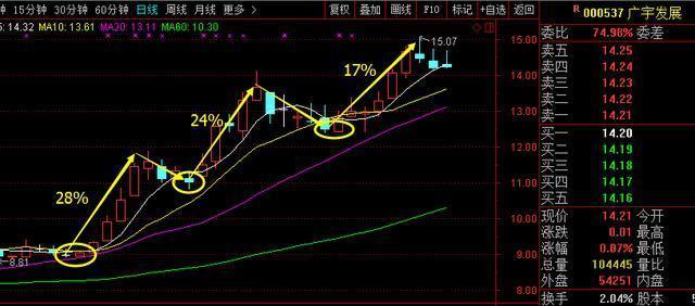 广宇发展这只股非常典型的一只上升回档股,也是非常本人选股思路的,多次进行了讲解,可以看到上升通道中的每一次回踩都是机会,随随便便把握其中一两波,收益都不会少。者整体69个点的涨幅,想必只要是专栏上的忠实粉丝都是把握到了。