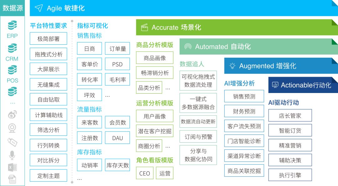 与传统商业智能不同,观远数据提出“AI+BI”的智能数据分析解决方案和“5A”落地方法论,将AI算法融入到BI建设中,为客户提供“Actionable Insight” - 真正可行动的决策建议。帮助企业在各个阶段基于智能数据分析完成数字化转型,重塑企业的竞争力,在复杂变化的商业环境中获得更多的增长机会。