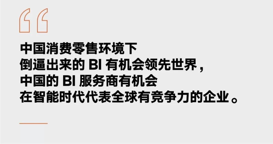 CEO,与业内人士深入交流使他更加坚信,中国消费零售环境下倒逼出来的BI有机会领先世界,中国的BI服务商有机会在智能时代代表全球有竞争力的企业,一如德国公司SAP在它的制造业时代。