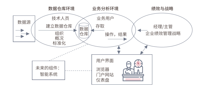 BI系统通常包括4个主要部分:带有源数据的数据仓库、业务分析(用于操作挖掘、分析数据仓库中数据的工具集)、用来监测和分析绩效的企业绩效管理(Business Performance Management,BPM)、用户界面(例如,仪表板)。这4个部分之间的关系如下图所示。