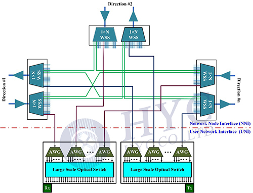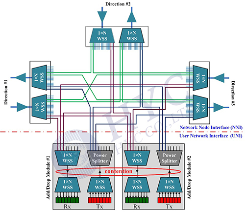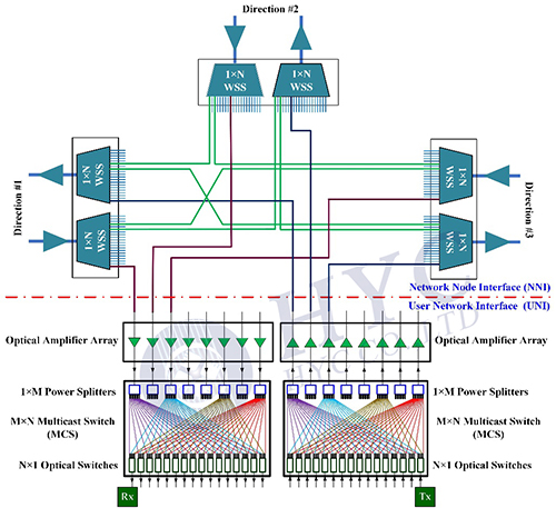 每个ROADM节点包含一个网络节点接口(NNI)和一个用户网络接口(UNI)。NNI互连来自/去往多个传输方向的DWDM信号,这些DWDM信号以波长粒度在各传输方向之间切换。UNI以波长粒度下载目的地为本节点的信号,并从本节点上传信号。为了实现无阻塞的波长交换和上/下载,新一代ROADM节点要求具有无色、无方向性和无竞争(CDC ROADM)的特点。