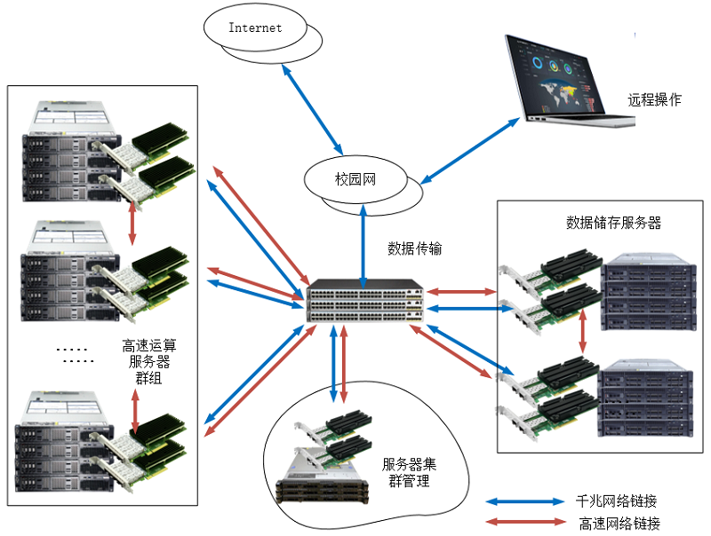 在计算机群组的相互连接上,计算机服务器之间的数据传输对带宽、网络的延时等具有高要求。在新材料技术、应用化学技术、动力模拟分析等方面的研究中,网络通过高速的、不受电磁影响、极低信号损耗的光纤链路进行连接,不仅能够保证各节点服务器的计算性能,同时可以加强服务器间的链接粘性,大的网络带宽和低延时性在设备之间的数据调用、读取上更具优势,满足服务器高密度、可扩展以及高网络带宽计算的要求。