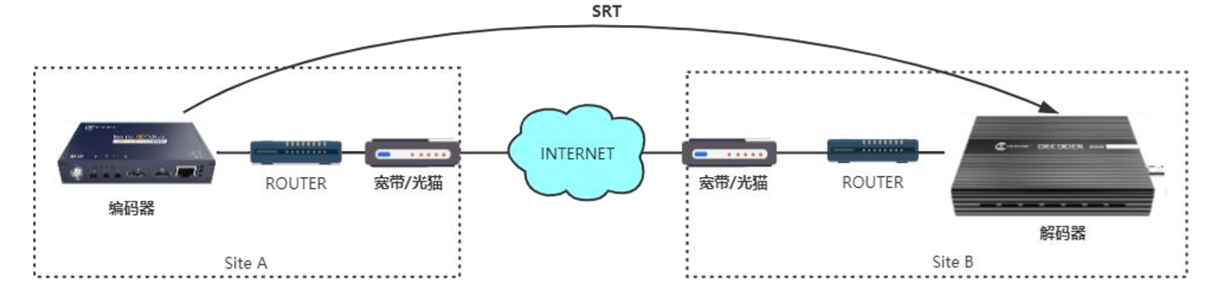 下面千视以普通组网环境的 A、B 两个站点为例,从站点 A的kiloview编码器以 SRT 方式实时将视频流传输至站点 B 的kiloview解码器,介绍如何实现公网传输方案。