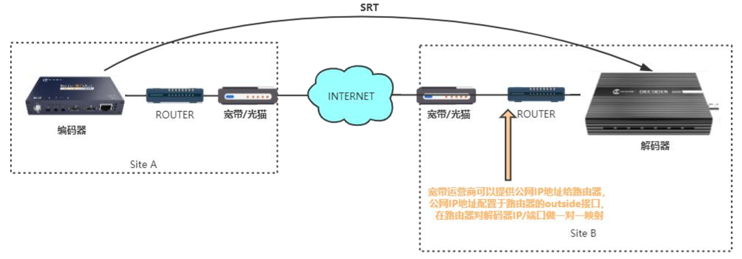 购买 IP 盒子及其宽带服务,IP 盒子可以在内网获取到公网 IP 地址,将解码器与之相连,并做好设备相应配置,即可实现 IP 盒子的公网地址与解码器私网 IP 地址的一一对应关系。这样,当对端设备以 SRT 方式连接 IP 盒子的公网 IP/端口时,IP 盒子即可将数据流转发至内网解码器设备。