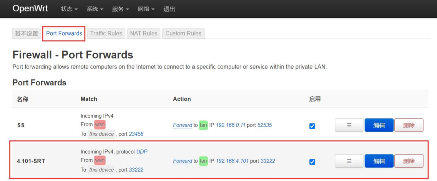 如下图所示,将外网地址的 UDP33222 端口,映射到内网 192.168.4.101(解码器 IP 地址,并保证这个 IP 地址与路由器是互通的)地址 UDP33222 端口。即,当对端设备采用 SRT 方式向本路由器公网 IP 地址的 33222 端口发起连接时,路由器会直接将该数据流转发给解码器 192.168.4.101 设备进行响应和回复。(SRT 是以UDP 协议传输的,因此端口映射必须配置为 UDP 协议)