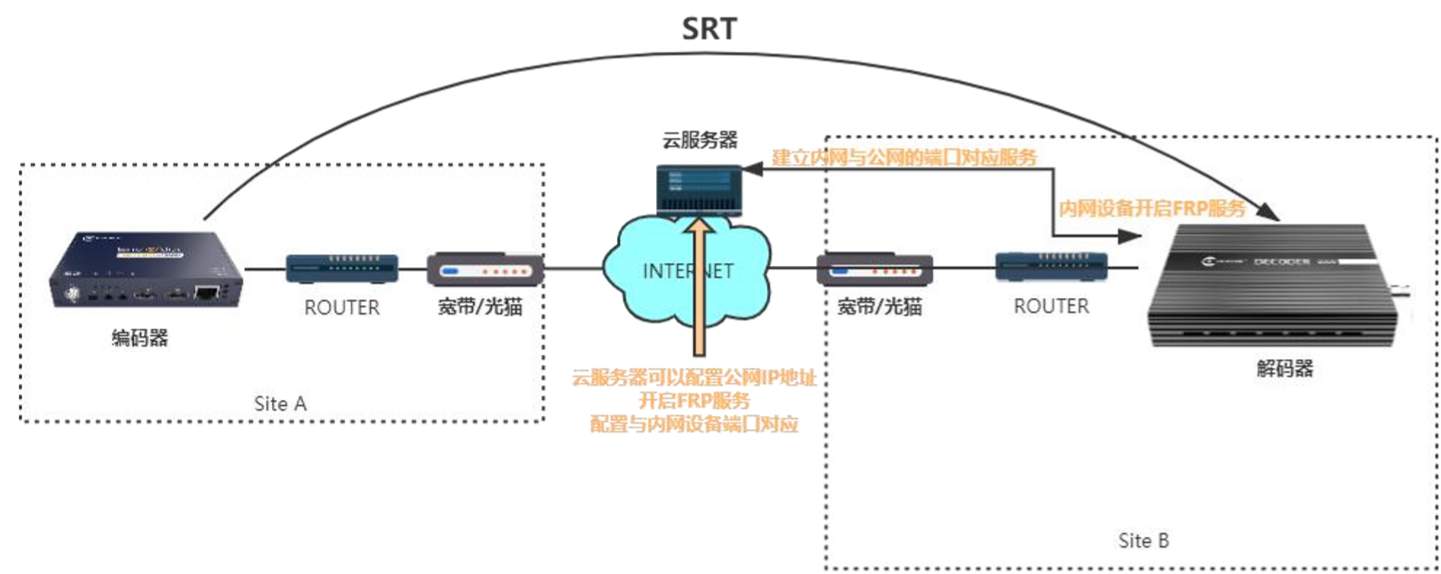 在云端购买一台服务器(云服务器可以提供公网 IP 地址),采用 FRP 方式做公网地址和私网地址的端口映射,当对端设备以 SRT 方式连接云服务器的公网 IP/端口,FRP 服务即可将数据流转发至内网解码器设备。