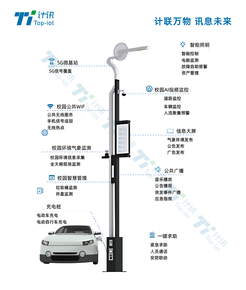 五:5G智慧合杆运用传感技术+无线通信技术+物联网技术,具备更多功能:流量监测、巡更打卡、一键报警、视频监控、照明控制、道路积水监测、LED信息发布、公共广播、充电桩、无线wifi等,广泛应用于园区、社区、景区、商业区、公路交通等。