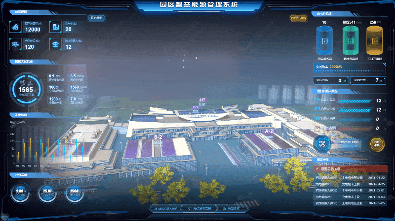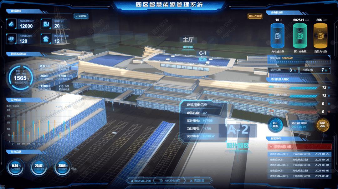 通过图扑软件 2D 可视化面板展示园区关键指标,对用户所关注的建设规模、光伏信息、发电信息进行统计展示,对各建筑的用电信息进行监测。