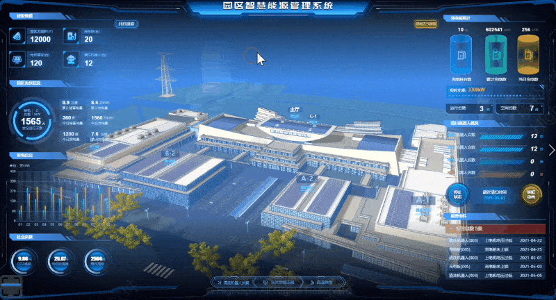 光伏板组件是一种暴露在阳光下便会产生直流电的发电装置,由几乎全部以半导体物料(例如硅)制成的薄身固体光伏电池组成。停车棚装上了光伏太阳能板,一块块太阳能电池板整齐排列,通过光伏组件,太阳能转化为电能,可以“自发自用”,帮助企业能源升级。在充电桩发生故障时,通过模型染色、告警动画等效果提示,为充电桩的实时使用情况和运行监控维护提供了便利。