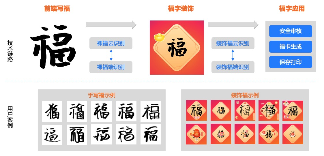 以扫五福场景为例,汇集了图像识别、语音识别、自然语言处理、传感器数据融合等多种 AI 技术。例如最常涉及的图像识别技术,用于快速、准确地识别用户扫描的福字图像,判断是否正确;传感器融合技术,结合手机运动传感器等辅助无障碍用户进行福字扫描;语音合成、识别技术,支持语音互动的各种创新玩法,如“语音打年兽”等。