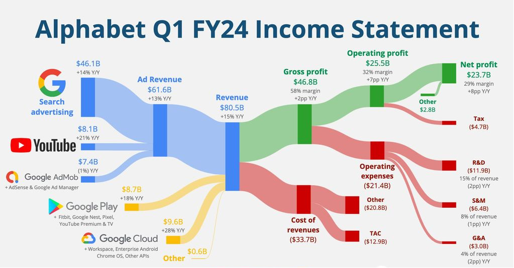 在2024年一季度财报发布后,谷歌盘后涨超10%,终于站稳加入了“2 万亿美元俱乐部”。