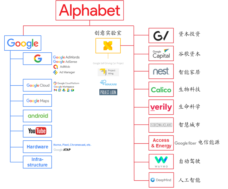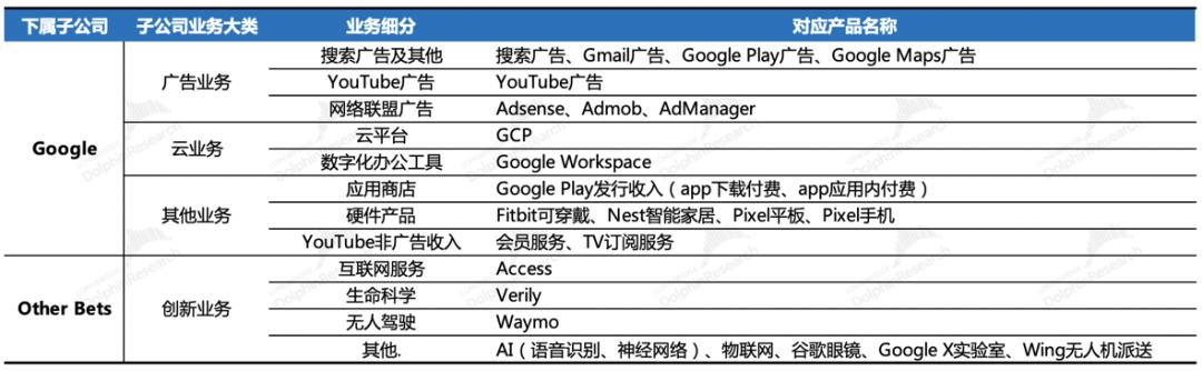 具体而言,谷歌现有业务可以分为三类:谷歌服务,谷歌云以及创新业务。其中,谷歌服务又可以分为广告业务和其他业务。