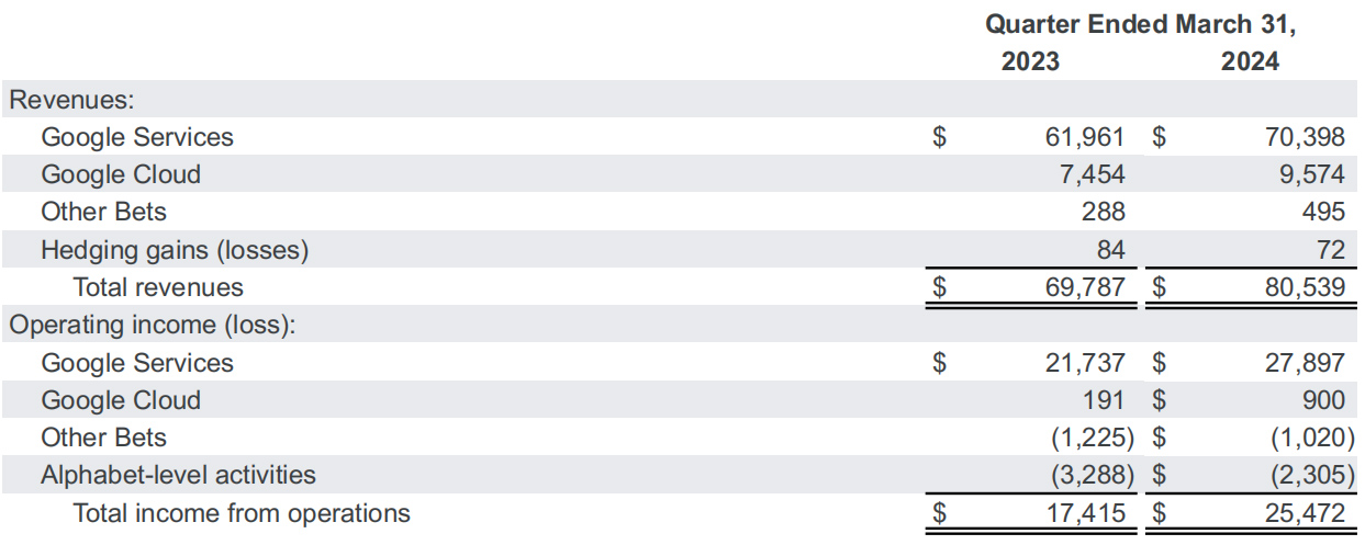 首先看谷歌服务。2024年一季度,谷歌服务的收入为703.98亿美元,超过预期的601.8亿美元。其中谷歌搜索及其他收入为461.6亿美元,超过预期的449.8亿美元。YouTube广告收入为80.90亿美元,较上年同期的66.93亿美元增长21%,高于预期的77.3亿美元。谷歌网络收入为74.13亿美元,较上年同期的74.96亿美元下降1%,低于预期的75.2亿美元。
